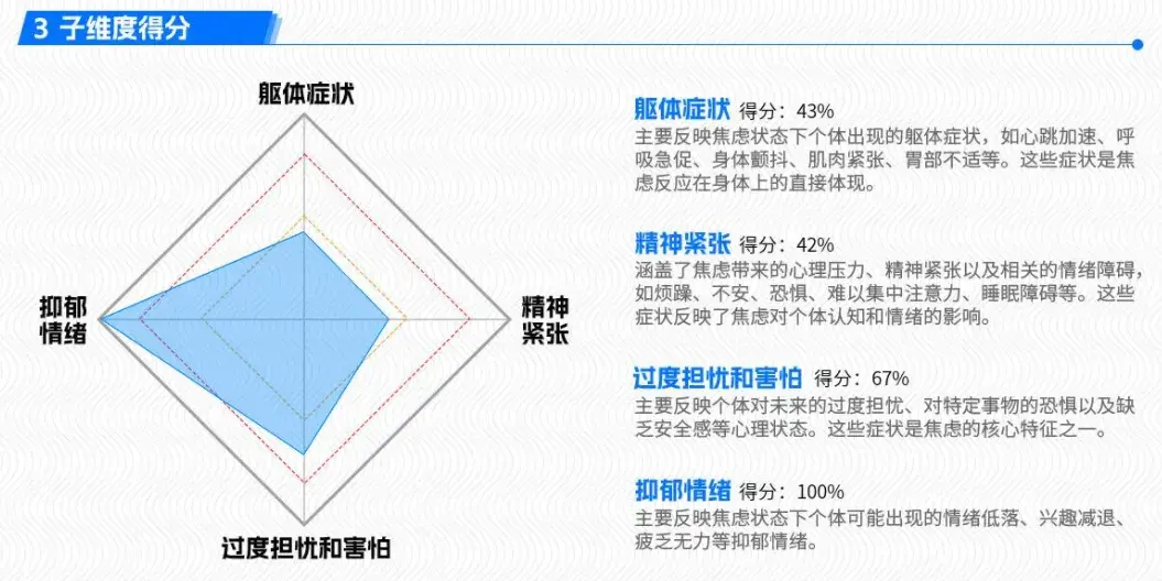 通过子维度,可以更加细致的了解焦虑集中的地方,以便做出进一步调整。下图为详细报告中子维度的雷达图。