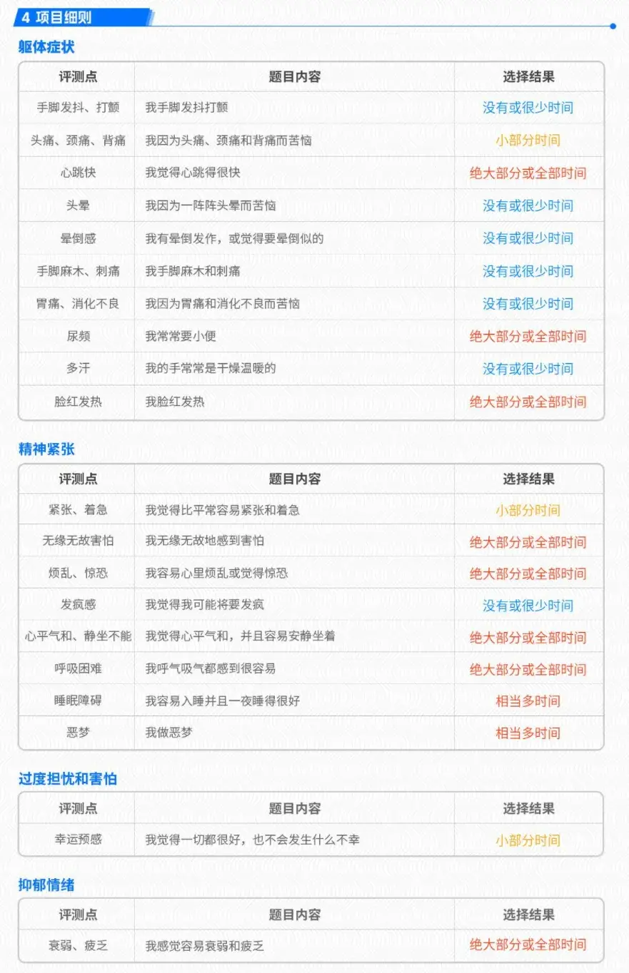 SAS通过简洁的20个条目,能够快速筛查个体是否存在焦虑状态,测试结果用正常、轻度、中度和重度4个分级评估。